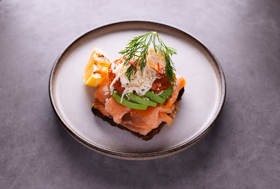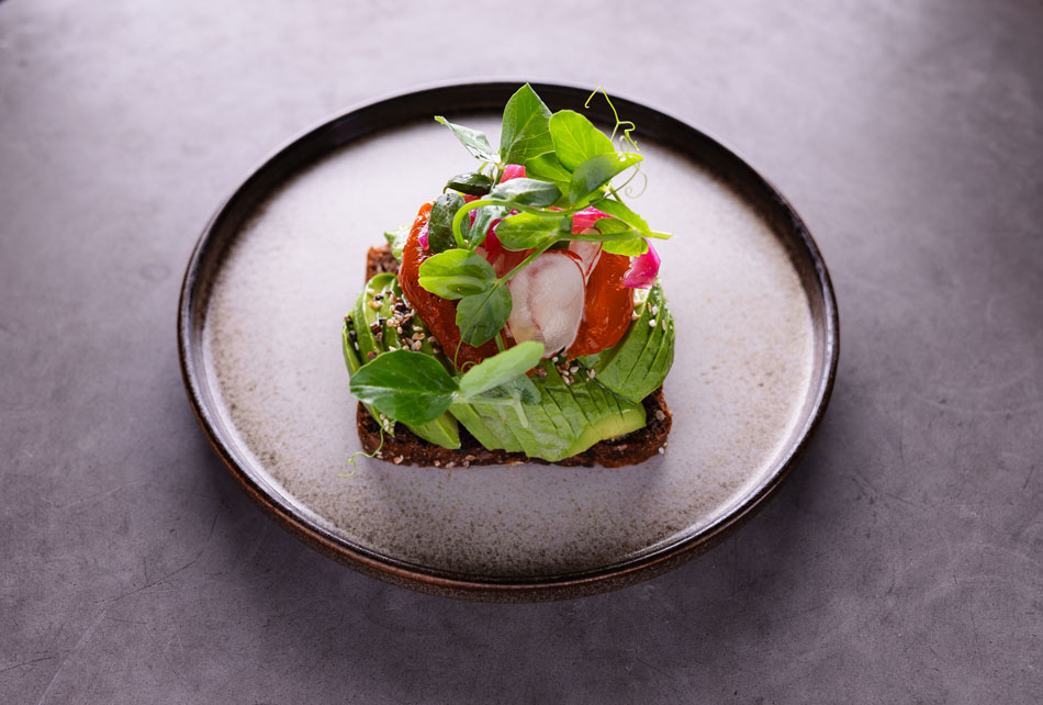 Avocado, røget laks, peberrodcreme, radiser & soltørret tomat