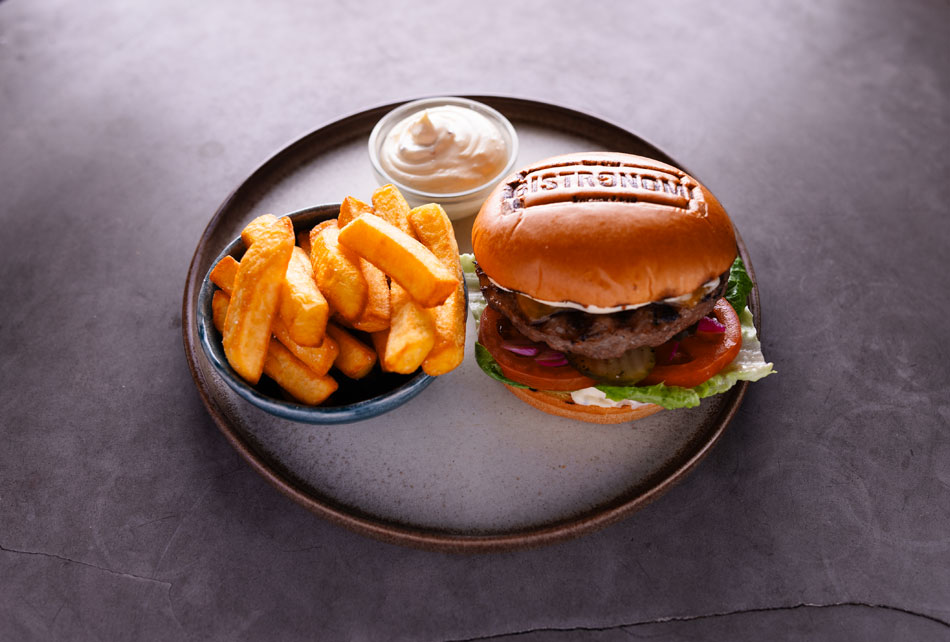 200 gram flammegrilet Angus bøf, brioche bole, cheddar, hjertesalat, tomat, syltede agurk & rødløg, dijonaise. Dip: Dijonaise
