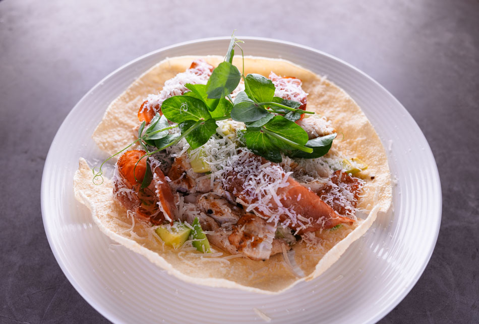 Flammegrillet kylling, sprøde papadums, hjemmelavet cæsardressing & parmesan
