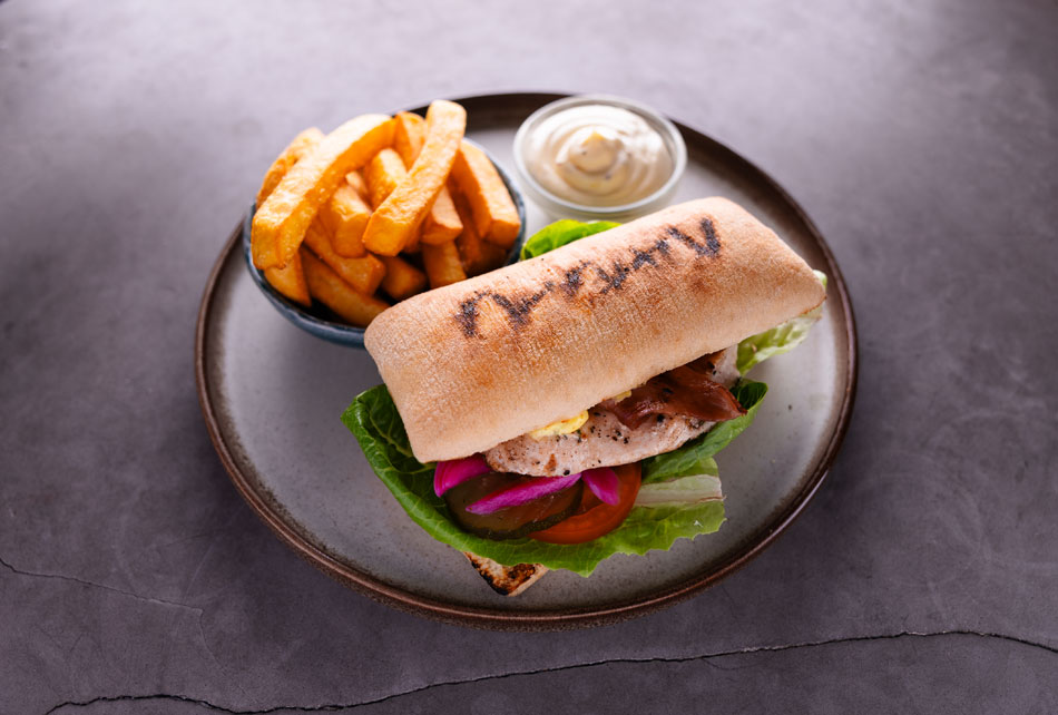 Marineret kyllingefilet, brioche bolle, hjertesalat, cheddar, syltede agurk & rødløg, & dijonaise. Dip: Dijonaise