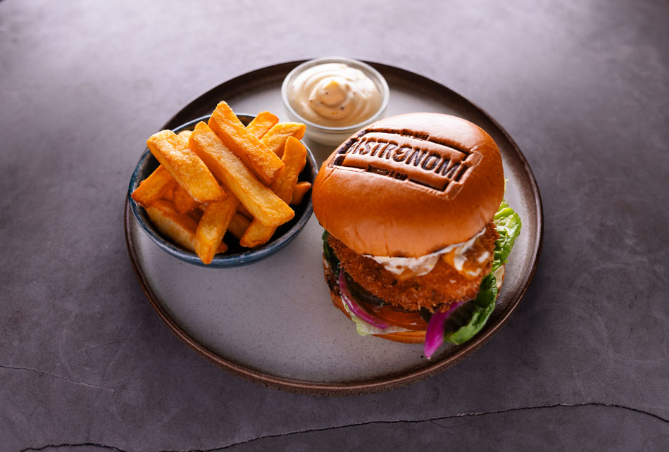 Kikærtebøf, brioche bolle, hjertesalat tomat, syltede agurk & rødløg, tomat ketchup. Dip: Sauce tatar