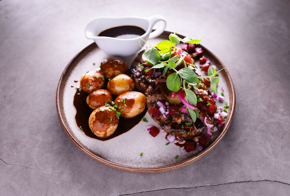 2 á 200 gram flammegrilet hakkebøfer, smørbagte kartofler, blød løg, rødbeder, syltede rødløg & agurk & brunsauce