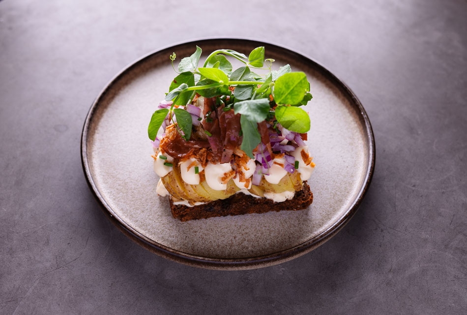 Grillet sesambrød, rygeost, peberrod, avocado & citron