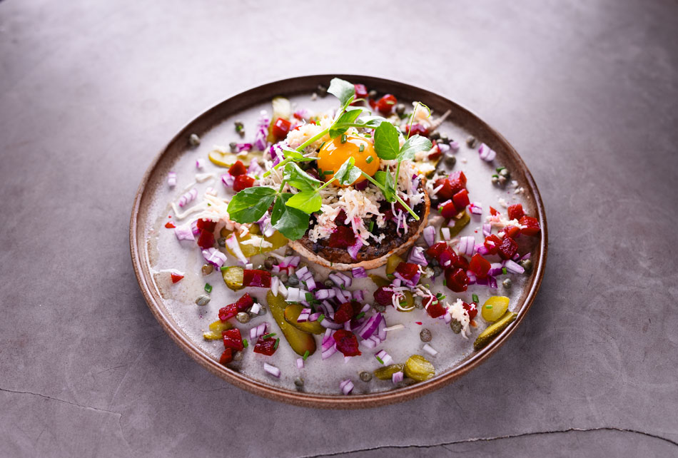 Flammegrilet bøf, stegt spinat, grilet brød, rødbeder, kapers, cornichoner, rå aggeblomme, rødløg & grønt
