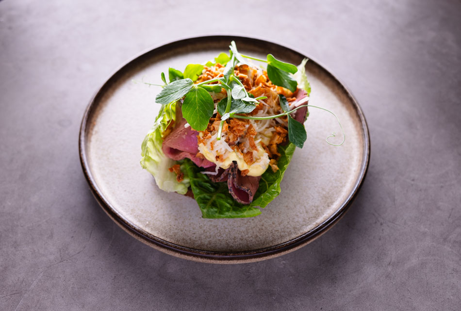 Salat, remo, friterede løg & peberrod