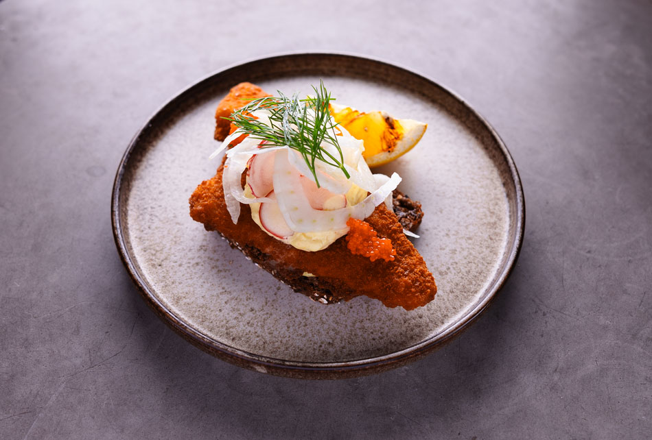 Paneret Torsk, grove fritter, sauce tartar, dild & citron