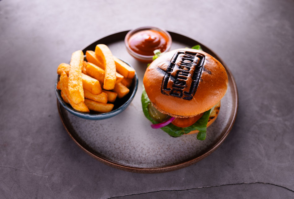 200 gram flammegrilet Angus bøf, brioche bole, cheddar, hjertesalat, tomat, syltede agurk & rødløg, chilimayo, jalapeños, salsa. Dip: Dijonaise+